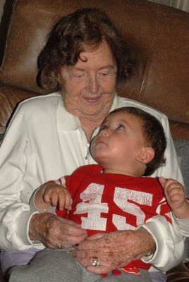 I cant remember exactly but this was either the first or one of the first times Brody visited Grandma Great. She couldn't get over how cute he was, she thought his clothes were adorable too. She would say "I didn't even know they made clothes like that that small." I think she really liked his tiny baby jeans.